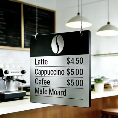 Tweekleurig vel voor hoogwaardige bewegwijzering Beeldsuggesties: Links - Mat goud op zwart tweekleurig vel eindproduct; Rechts - Hoogwaardig toepassingsscenario voor koffiebars